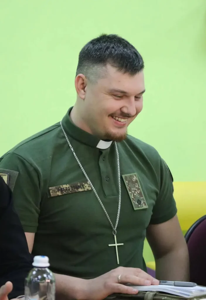 Sí, cuando empezó la invasión a gran escala me encontraba en el frente. En mayo, mientras defendíamos una posición en primera línea, sufrimos fuego de artillería durante más de doce horas. A sólo dos metros detrás de mí, un compañero, “Banker”, fue alcanzado en el cuello por la metralla y murió en el acto, pero a mí me alcanzaron fragmentos más pequeños que me causaron una grave herida en el brazo. Me llevaron a un hospital de Bakhmut y los médicos me dijeron que la cosa pintaba mal. Aún no sé cómo Dios salvó mi brazo, pero lo hizo. Me trasladaron a Alemania para mi rehabilitación y a la vuelta a casa volví de nuevo al combate. Sin embargo, finalmente se me dio la oportunidad de convertirme en un capellán militar en diciembre de 2024. Ese fue mi camino, que seguí conscientemente porque cuando eliges seguir la llamada entiendes que eres mucho más grande que un simple mecanismo en la guerra. Mi llamada en 2017 me ha hecho convertirme en el capellán de una brigada.